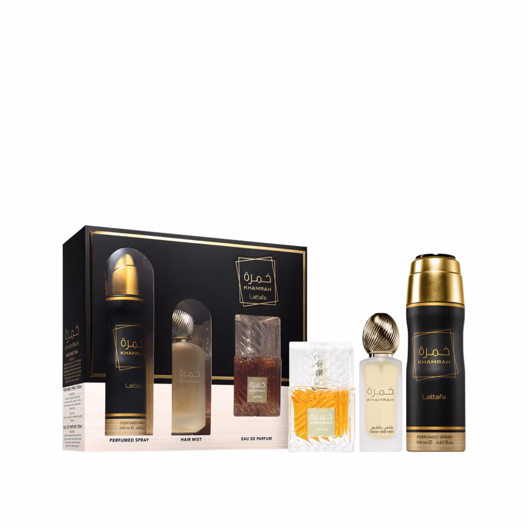 Khamrah de Lattafa Perfumes es una fragancia de la familia olfativa Aromática Especiada para Hombres y Mujeres. Esta fragrancia es nueva. Las Notas de Salida son canela, nuez moscada y bergamota; las Notas de Corazón son dátiles, praliné, nardos y Mahonial; las Notas de Fondo son vainilla, haba tonka, Amberwood, mirra, benjuí y Akigalawood.
