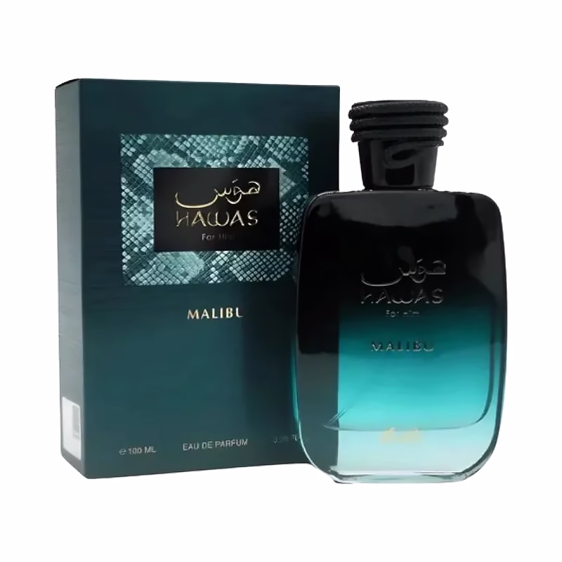 Hawas Malibu de Rasasi es una fragancia de la familia olfativa Aromática para Hombres y Mujeres. Las Notas de Salida son piña, naranja y toronja (pomelo); las Notas de Corazón son raíz de lirio, ámbar y lavanda; las Notas de Fondo son haba tonka, almizcle, pachulí y cachemira.